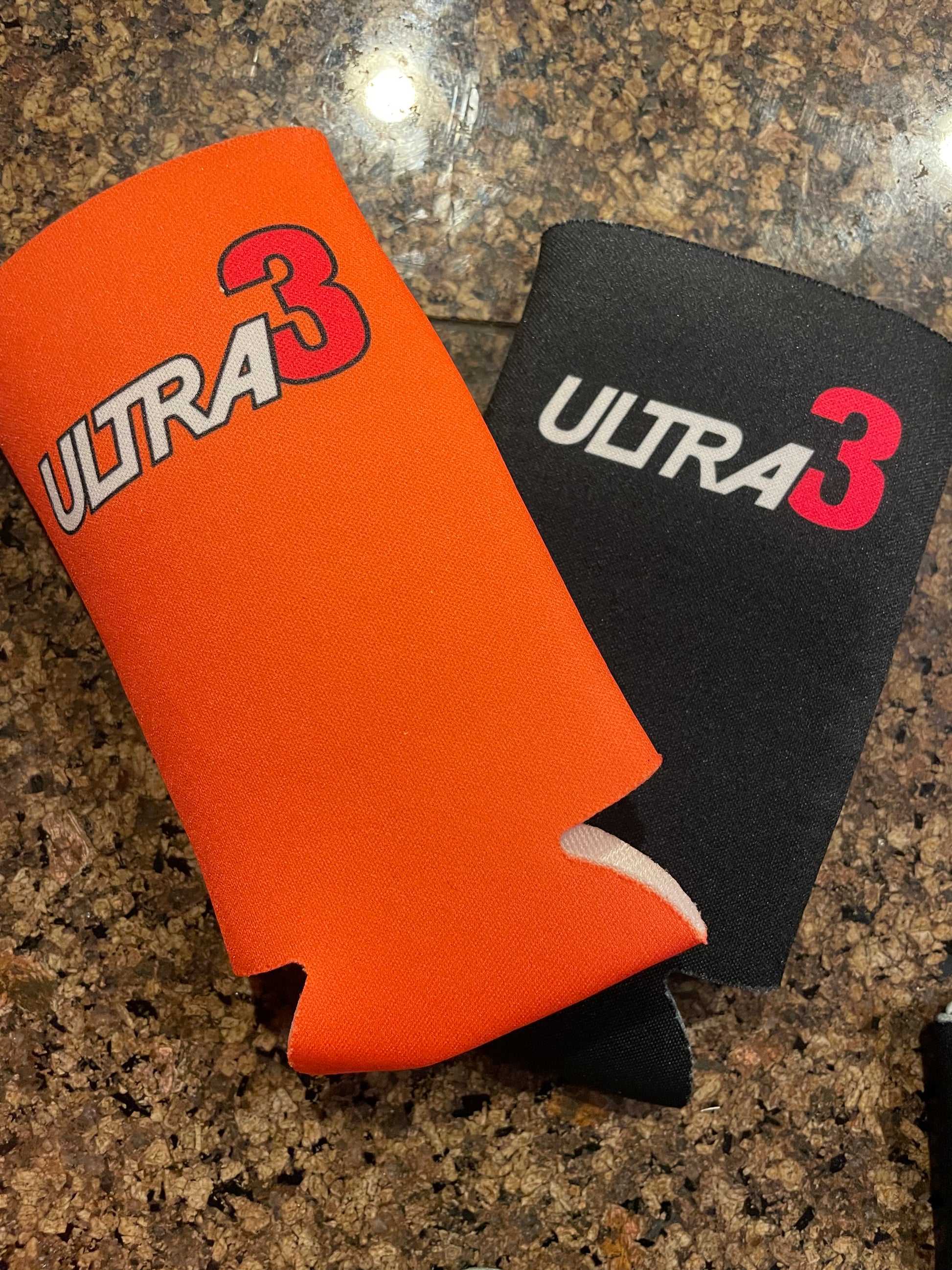 Skinny can Koozie in orange and black.
